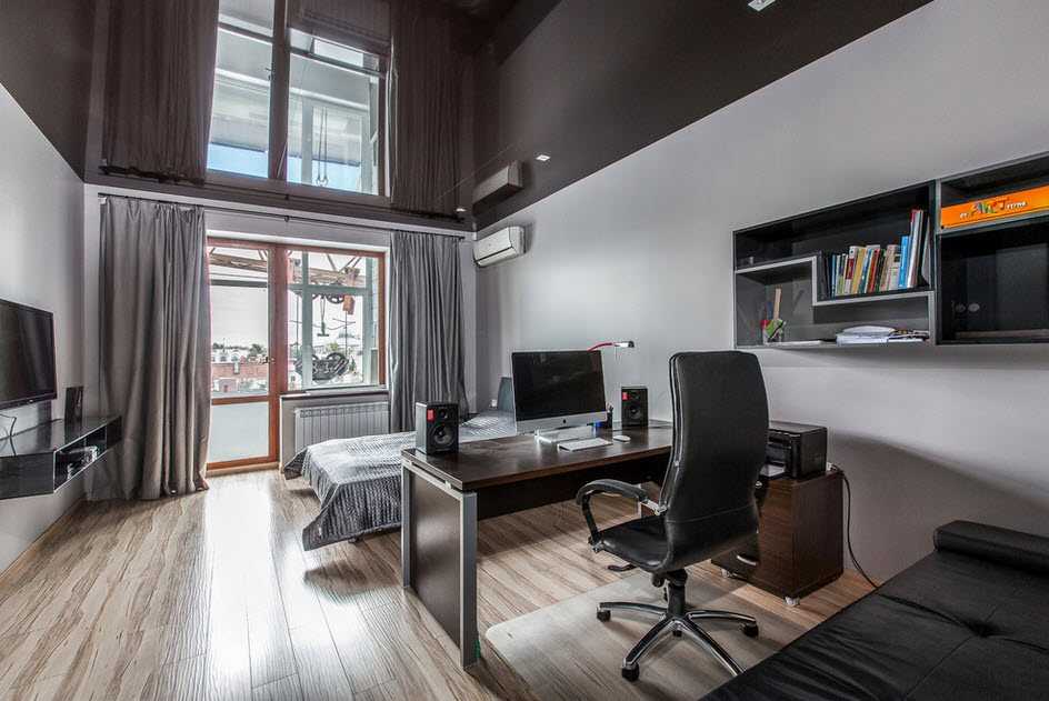- Глянцевая поверхность — визуально делает потолок немного выше за счет множественных отражений;