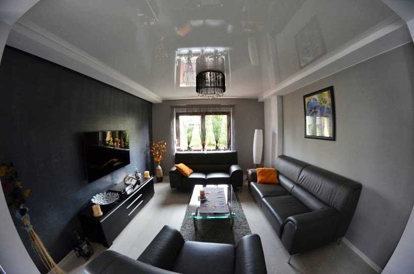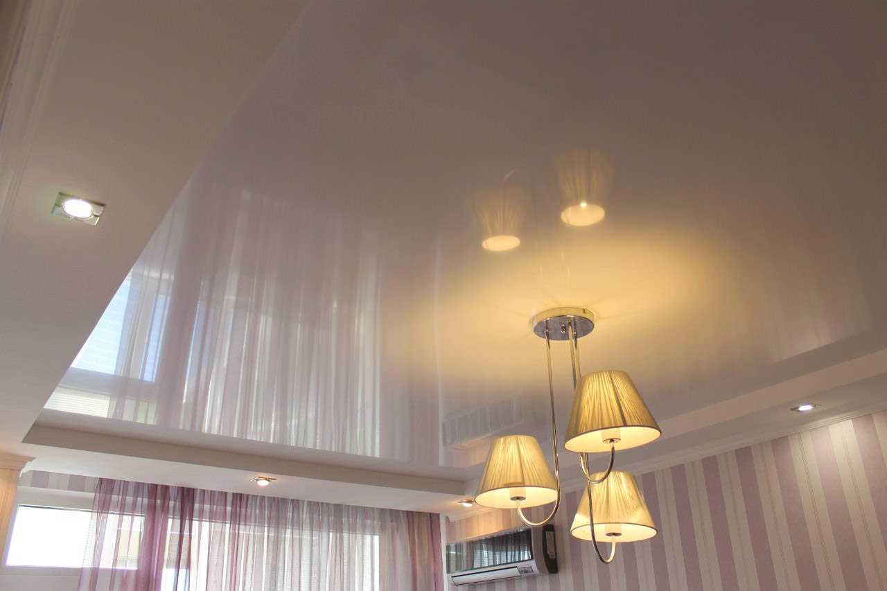 2. Глянцевый натяжной потолок подразумевает использование обычной ПВХ-плёнки, покрытой лаком. Отражающий коэффициент таких материалов самый низкий по сравнению со всем остальными вариантами, рассматриваемыми в данной статье. Строго говоря, чистой зеркальности в данном случае нет, а есть только отражающая поверхность. Тем не менее, этот вариант отделки достаточно популярен. Уникальность способа в том, что плёнкой можно закрыть площадь всего потолка без видимых швов и каркаса и в этом есть несомненное преимущество.