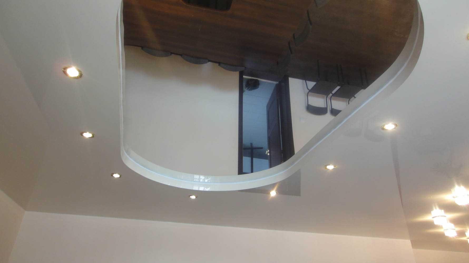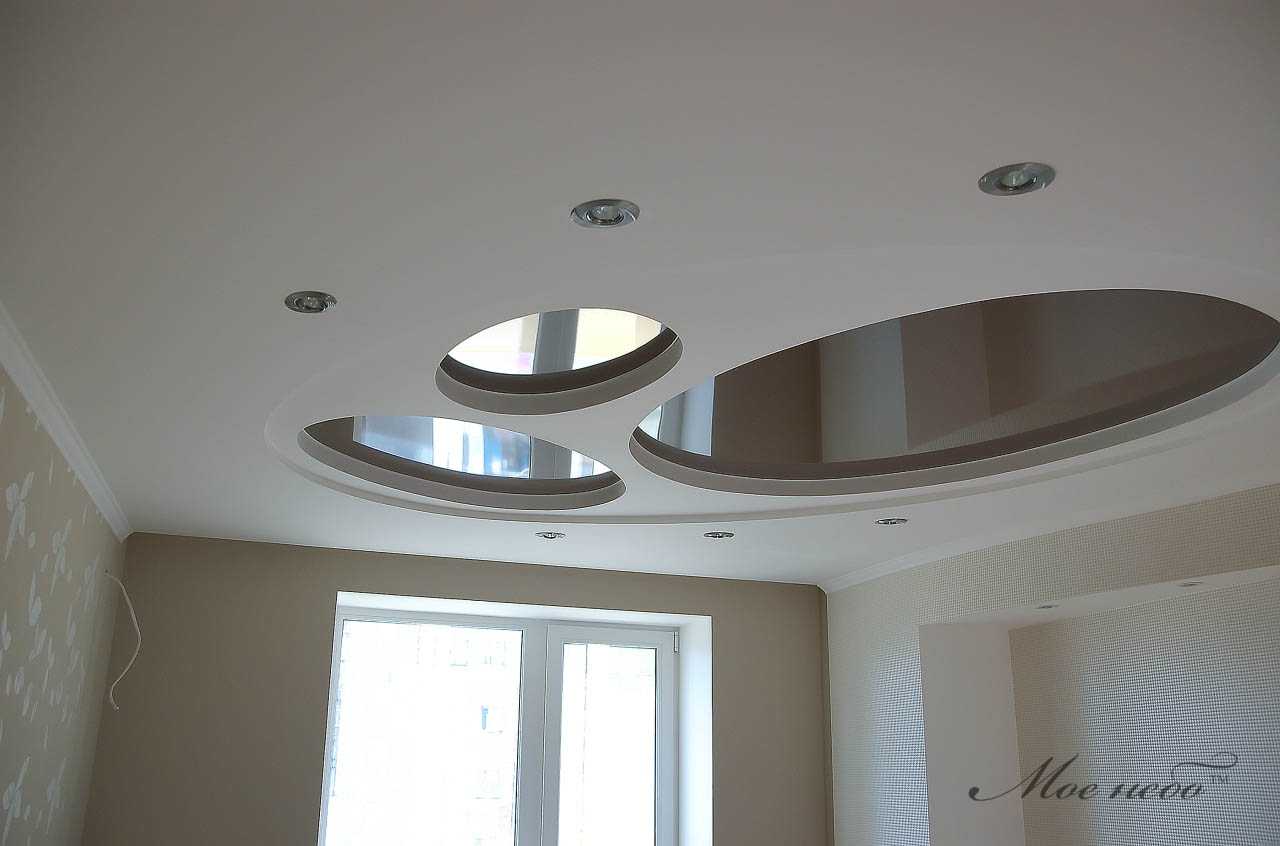 - использование зеркальных модулей — комбинированный вариант для потолочных конструкций с 2 и более уровнями, сочетающий несколько типов отделки: подвесной гипсокартонный потолок + пвх-пленка или матовая пвх-пленка + отражающий модуль.