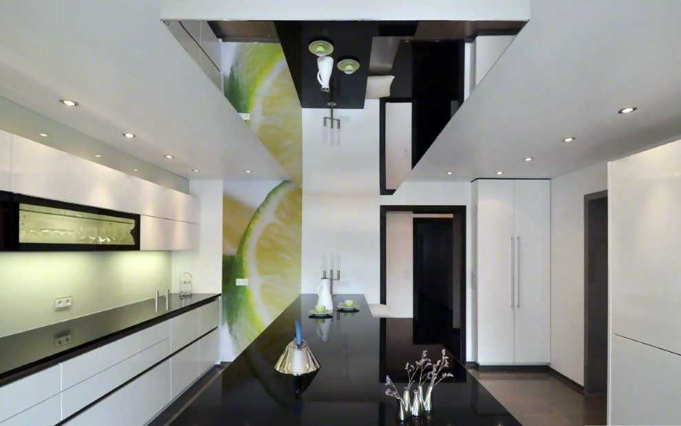 Использование покрытой специальным лаком ПВХ-пленки позволяет добиться красивого зеркального эффекта независимо от цвета используемого полотна и особенностей монтажа в каждом отдельно взятом случае. Вариантность предоставляет в руки владельцам недвижимости отличный инструмент выразительности, позволяющий органично совмещать в одном помещении на общей потолочной поверхности сразу несколько типов материалов.
