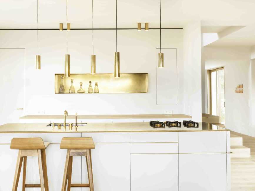 Золотисто-желтые осветительные приборы выгодно смотрятся на фоне и светлых, и темных стен.
