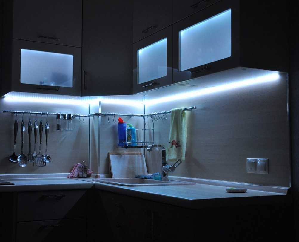 При установке таких светильников в верхней части кухонного гарнитура можно обойтись без использования люстры. Лента из светодиодных элементов имеет привлекательный внешний вид, бывает одноцветной или многоцветной.