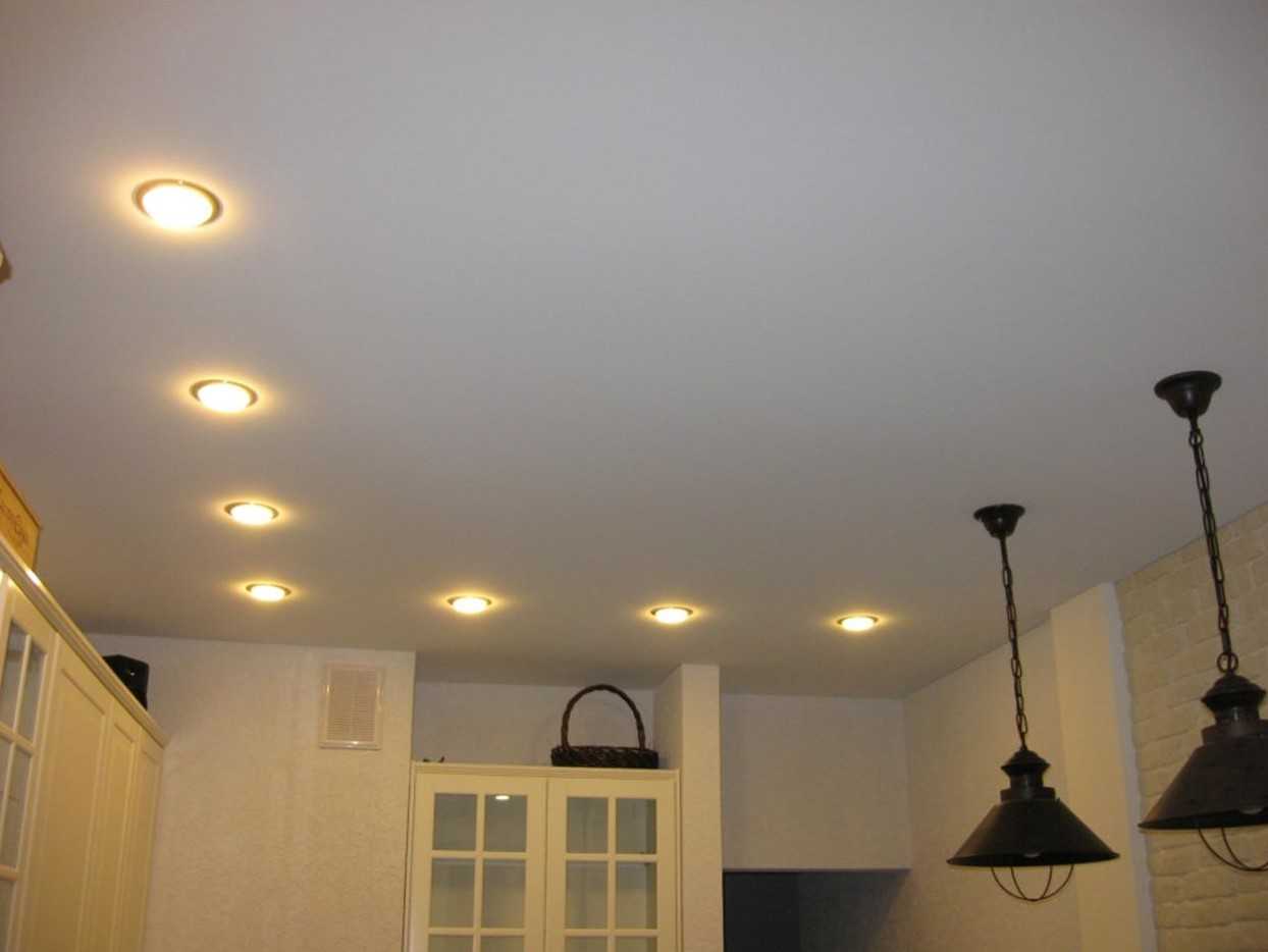 Но зонированная подсветка кухни не исключает наличия люстры. Его функциональная ценность невелика, так как световое пятно получается в центре комнаты, которая в основном пуста. Но с точки зрения выравнивания неравномерного освещения этот способ очень хорош. Как вариант, можно использовать несколько точечных светильников, как на фото выше, или установить встроенные потолочные светильники, если потолок подвешен или подвешен к гипсокартону.