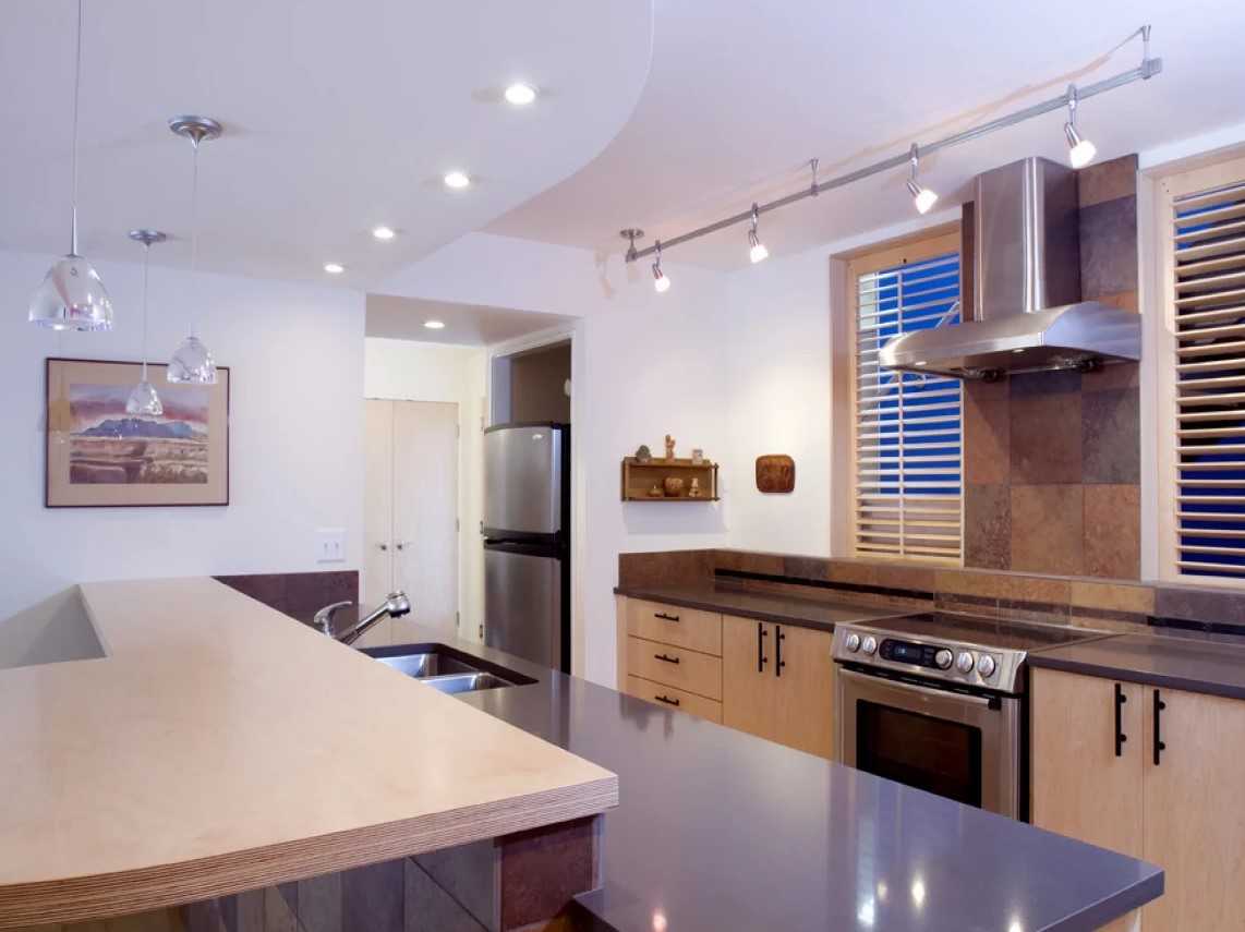 На кухне есть две основные зоны с разным назначением — рабочая зона для приготовления пищи и обеденная зона. Для каждой требуется разное освещение: в рабочей зоне должно быть более яркое освещение, а в обеденной — более мягкое.