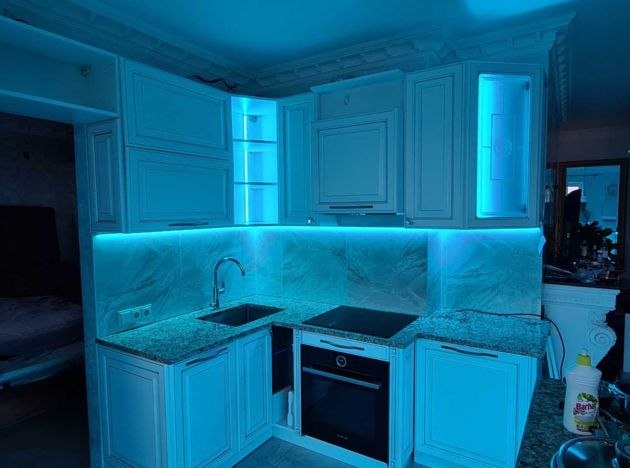 Если протянуть светодиодную ленту по периметру между потолком и гарнитуром, можно добиться полезного оптического эффекта расширения пространства. Это хороший лайфхак для владельцев скромных по полезной площади хрущевок с очень низкими потолками.