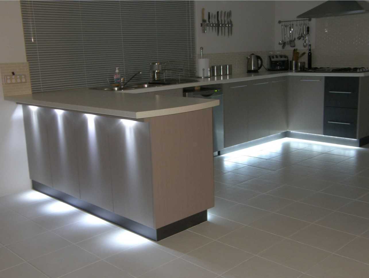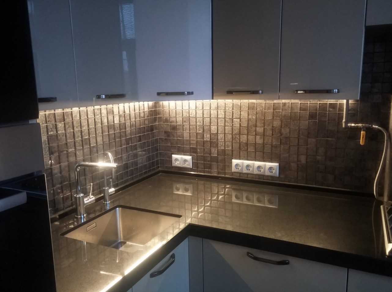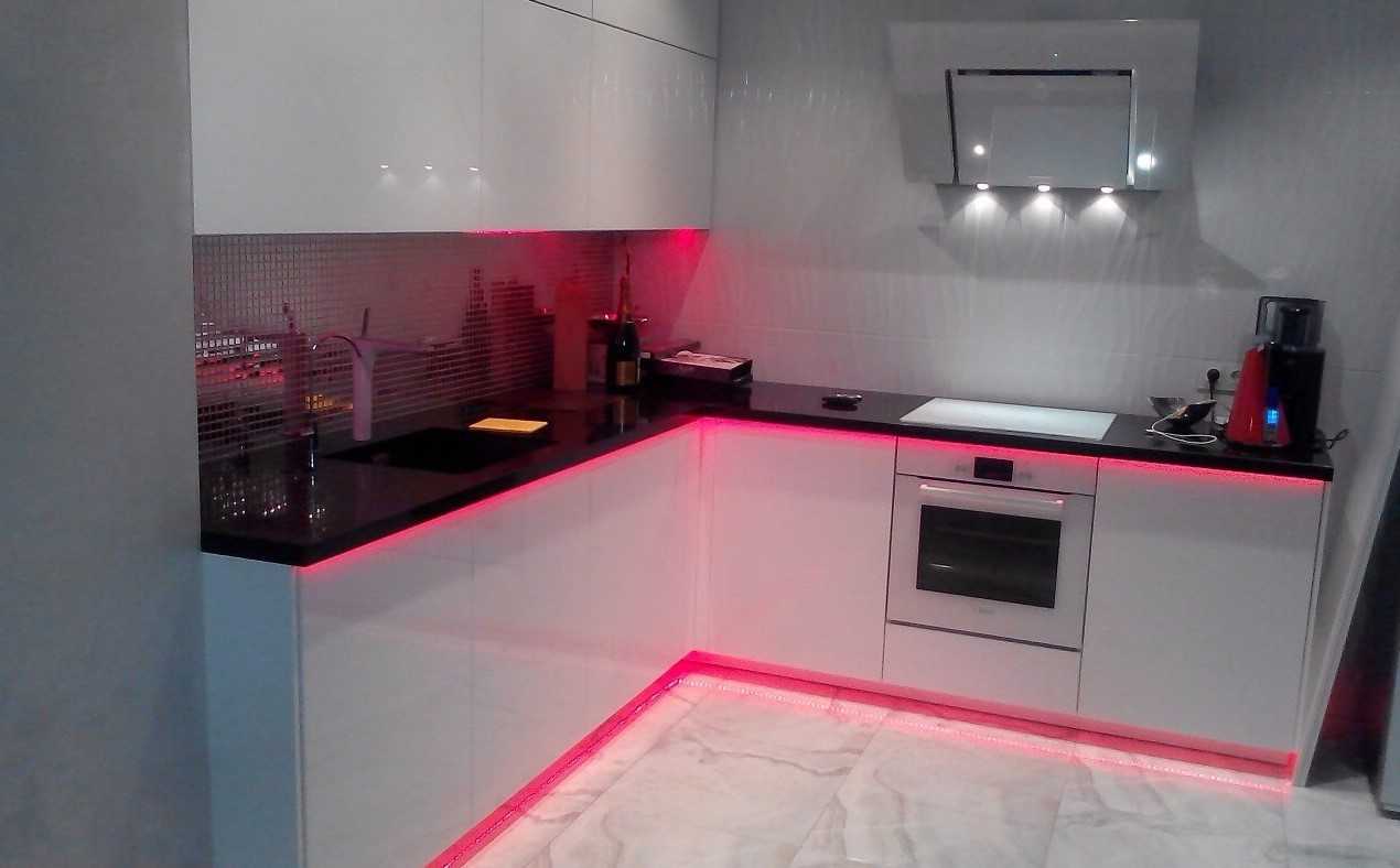 Внутренняя подсветка шкафчиков. Такая организация подсветки упростит хозяйке поиск мелких предметов, хранящихся в недрах шкафа. Рекомендуем сделать так, чтоб она автоматически включалась каждый раз, когда открываются дверцы шкафа. Для этой цели используется светодиодная лента. Она фиксируется по внутренней поверхности крышки шкафа и под каждой полкой, за исключением нижней. Подсветка фартука. Интересная идея для тех, кто планирует ремонт маленькой кухни. Откажитесь от фартука, оформленного керамической плитки. Вместо классики — стеклянный фартук со светодиодной подсветкой. В результате и рабочая зона освещена, и дизайн кухни выглядит современно.