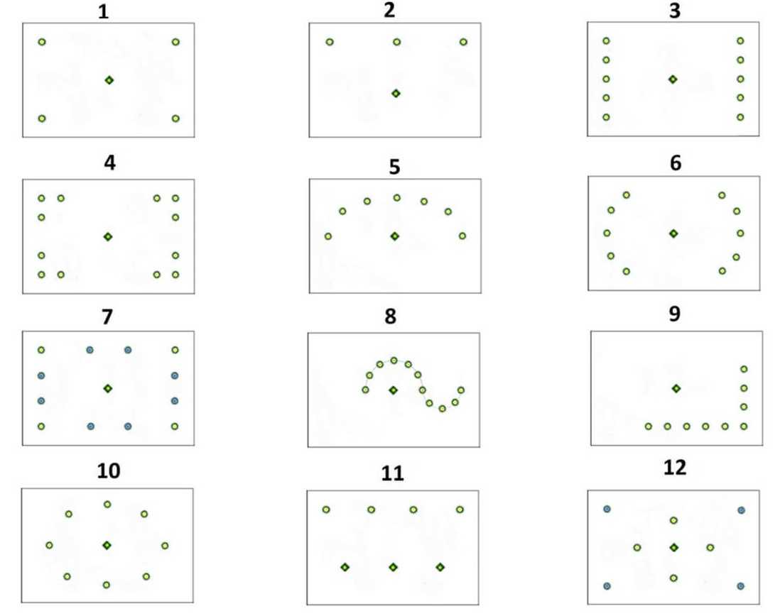 Один из самых популярных способов оптимизации светового потока в пространстве кухни. На изображении ниже продемонстрированы практически все варианты их расположения на потолке. Отметим, что каждый спот освещает примерно на 1-1,5 метра вокруг (в зависимости от того, сколько люмен выдает встроенный в него светодиод).