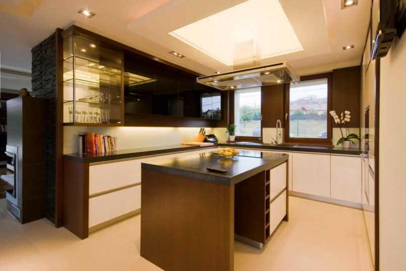 Продумывая освещение кухни с большой площадью, всегда есть где разгуляться. Опытные дизайнеры рекомендуют выбирать для этой цели поворотные точечные светильники. Их можно располагать как по периметру, так и в хаотичном порядке.