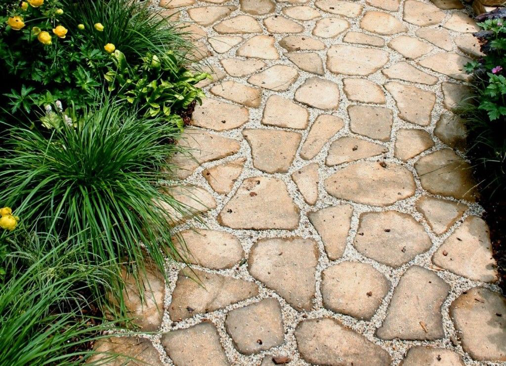 В данном случае обойтись можно всего одним трафаретом, но при использовании 2-3 форм работы пойдут еще быстрее. Украсить поверхность дорожки, изготовленной таким образом, можно путем обработки металлической теркой, выдавливанием отпечатков, вдавливания стеклышек и прочих предметов или же путем окрашивания подсохшей поверхности.