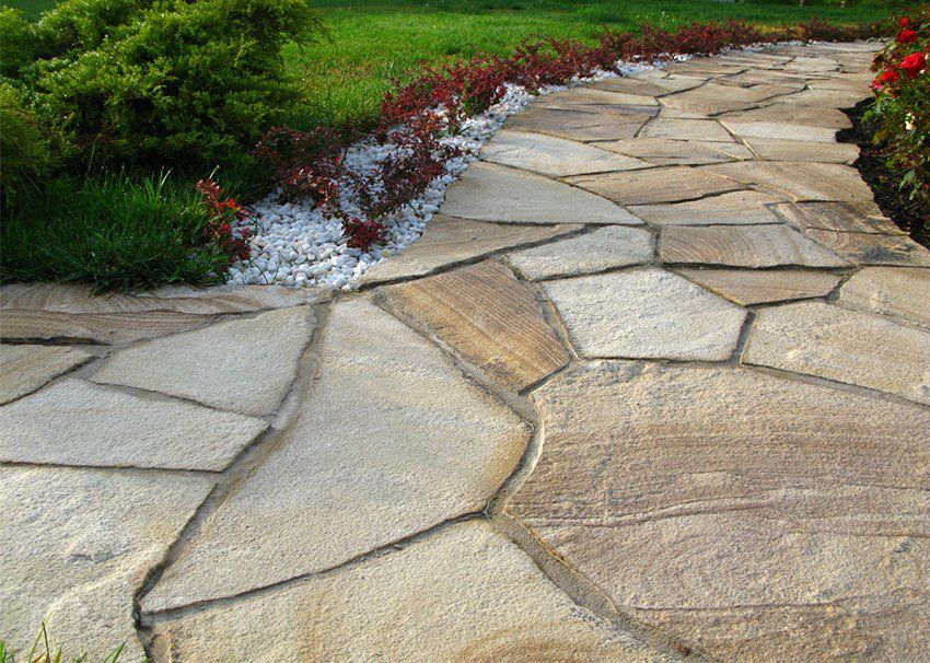 - Из серых, неправильной формы бетонных плит. Бетонные серые плиты можно выложить друг возле друга в три ряда и придать тропинке извилистую форму. Между элементами нужно оставить небольшой зазор. Швы заполняют песком или грунтом. По бокам такой тропинки можно высадить растения, посадить кустарники и деревья.