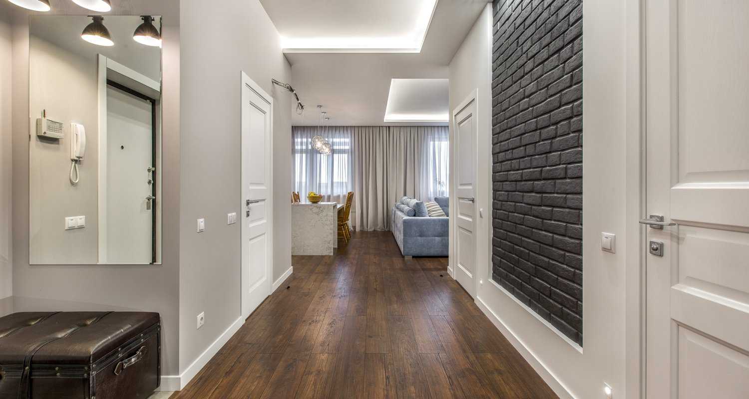 под цвет напольного покрытия – классический и самый распространенный метод, позволяющий плинтусу слиться с полом. Вероятность испортить интерьер сводится к минимуму, поэтому способ рекомендован всем тем, кто опасается смелых контрастных решений. Допускается использование плинтуса на один-два тона светлее или темнее напольного покрытия. Данный вариант отлично подходит, когда в комнате используется массивная доска, паркет, ламинат или линолеум;