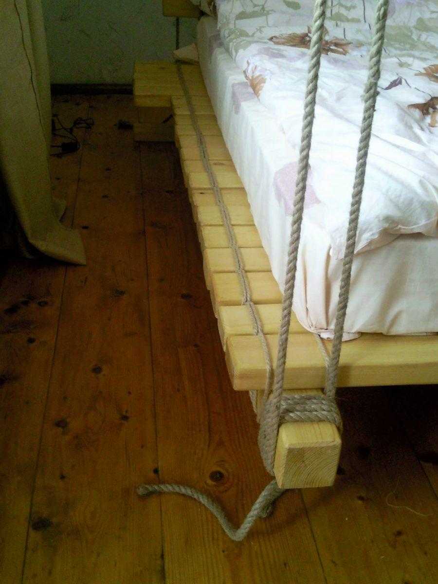 Затем каркас кровати подставляется к стене. Такой способ смотрится очень оригинально в интерьере.