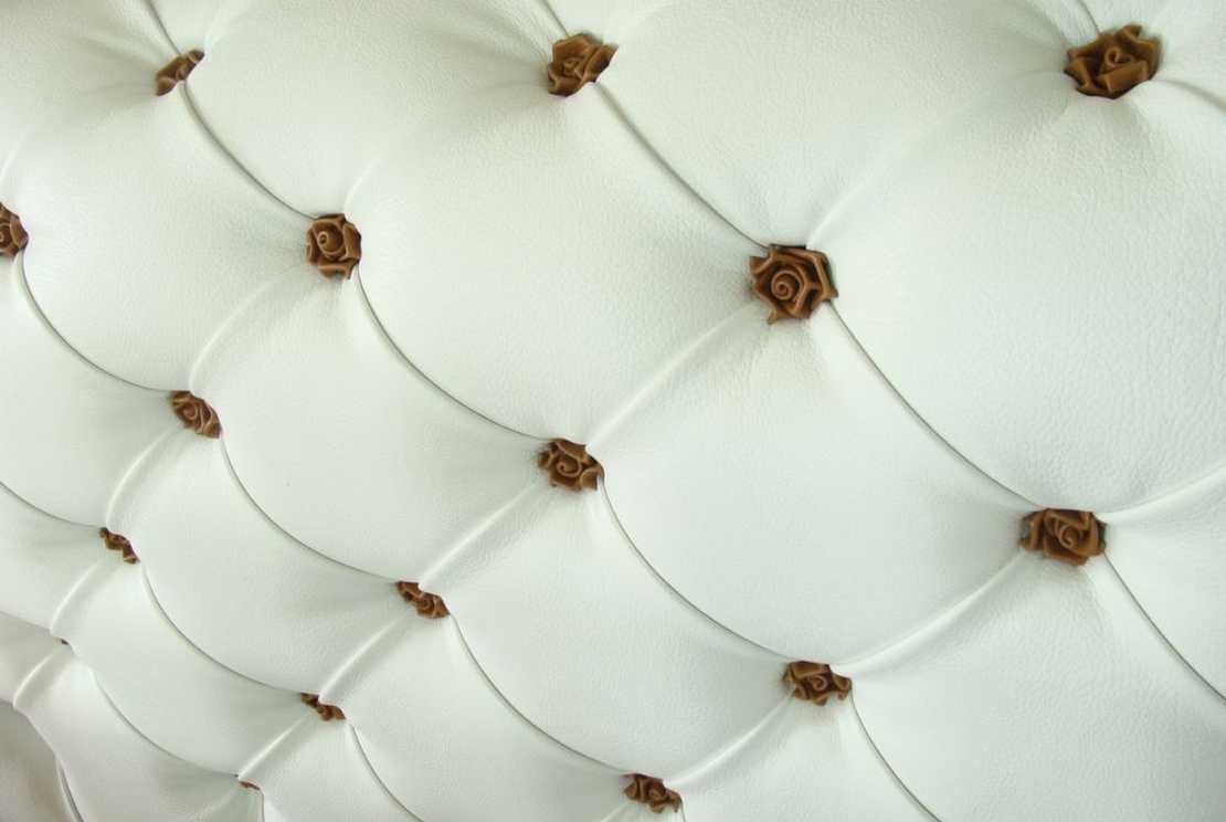Пуговицы можно использовать для имитации каретной стяжки на ткани. Щит обтягивается слоем тонкого поролона, затем сверху покрывается тканью или кожей. Концы ткани и поролона закрепляются на обратной стороне основы с помощью мебельного степлера. Затем на лицевой стороне спинки пришиваются пуговицы, в шахматном порядке, созданные на ткани углубления с виду становятся похожими на каретную стяжку прошиваемую на производстве. Далее остается только закрепить мягкую спинку на стене.
