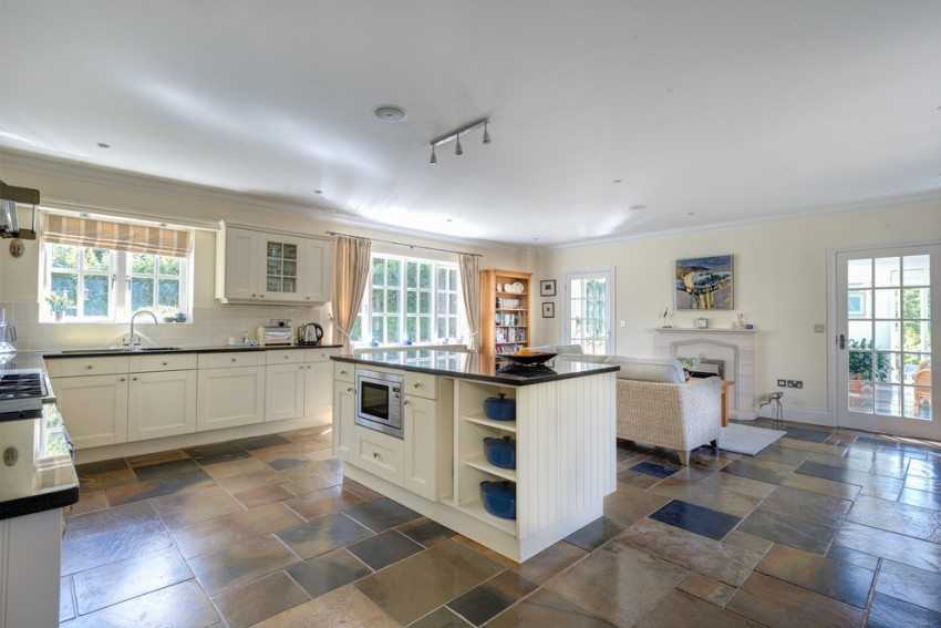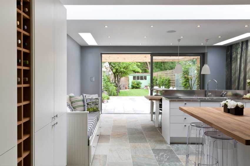 В частном доме популярным решением является совмещение кухни и гостиной. В этом случае с помощью плитки можно зонировать пространство – например, выложив из нее ковер в обеденной зоне.
