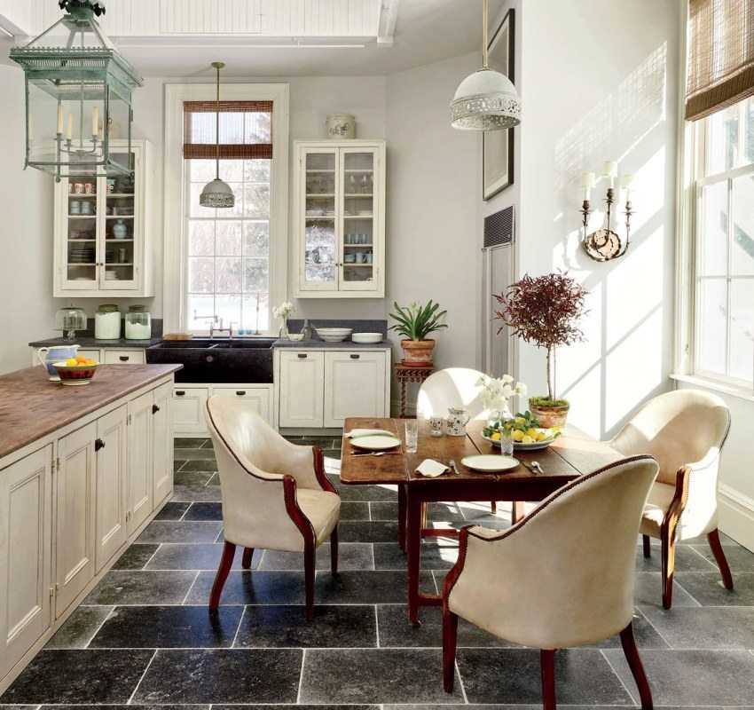 Идеальное положение пола из плитки в общем дизайне кухни – чуть темнее стен, но светлее мебели, и наоборот.