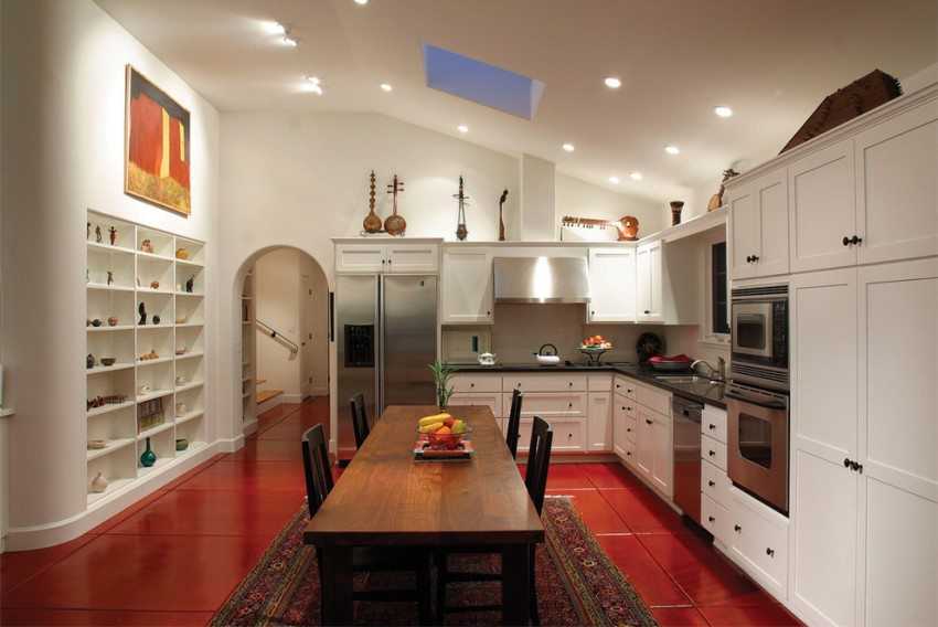 В просторных кухнях в частном доме можно позволить себе эксперименты со способом укладки, цветом и рисунком. Но помните, что «нарядным» в интерьере должно быть что-то одно.