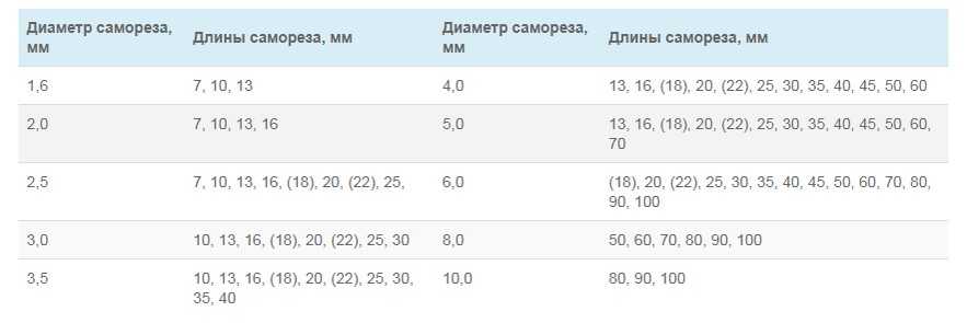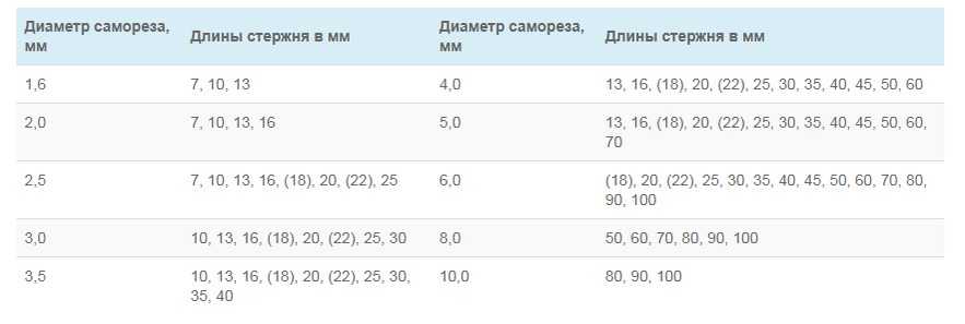 Теперь сравните две таблицы. Они составлены по разным ГОСТам. Как видите, диаметры и длины совпадают. Вот это и облегчает жизнь. Если при производстве крепежа придерживались стандарта и по соотношению диаметра/длины, то все просто. Если же нет, то производитель в описании саморезов прикладывает таблицу с размерами (как на рисунке выше).