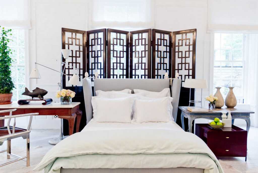 Легкая ширма с ажурной резьбой или плетением способна украсить вашу спальню