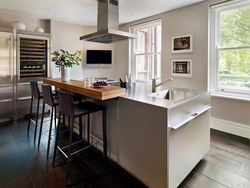 Барные столы компактны и с их помощью можно зонировать пространство кухни