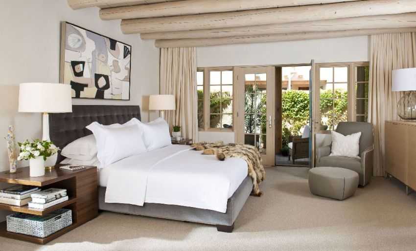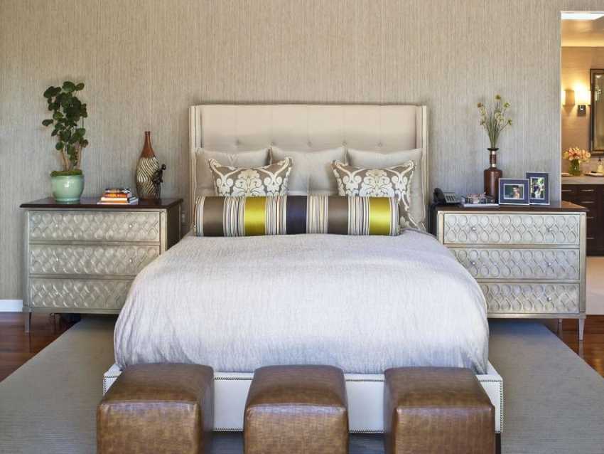 Чтобы уравновесить стороны с тумбочками разной высоты, используют настенные зеркала, фото или картины, расположенные на одном уровне. Для балансировки можно применить и светильники разного размера.