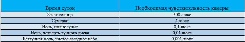 От чувствительности, измеряемой в люксах, зависит уровень освещённости, при котором возможна трансляция картинки, позволяющей хорошо различать детали. При ясной погоде в полнолуние от камеры, имеющей чувствительность в одну десятую люкса, будет поступать изображение хорошего качества.