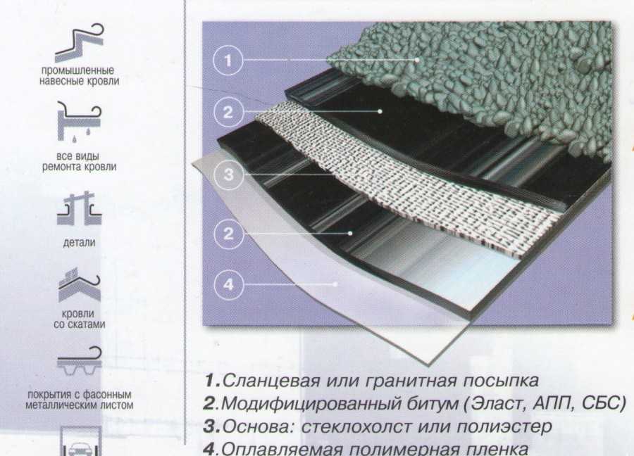 По характеристикам – это тот же обычный рубероид, с картонной основой, обмазанного слоем вяжущего вещества. Благодаря этому составу и получается хорошее, герметичное сцепление с кровлей. Монтаж осуществляется при помощи горелки, которой расплавляют материал, при этом применять мастику не нужно. Покрытие будет служить 15 лет