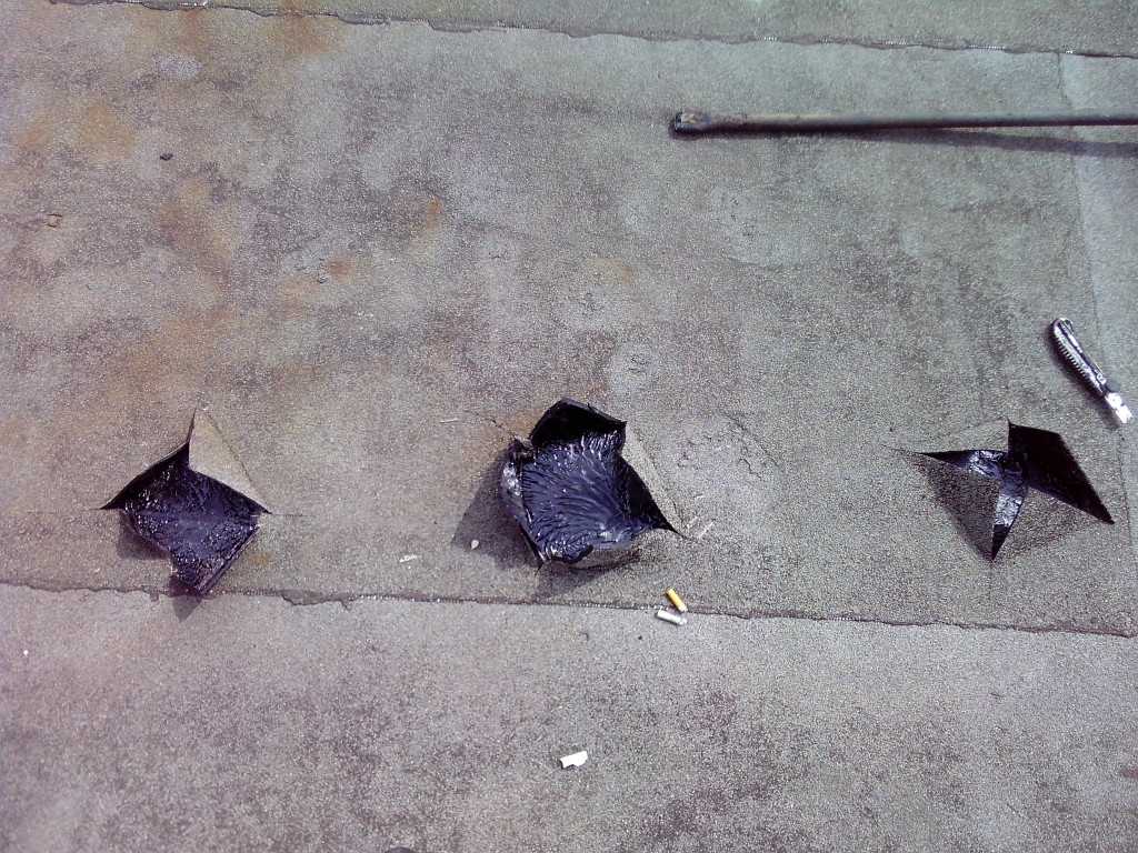Затем приступают непосредственно к наложению заплат. Из нового рубероида вырезают кусок, в точности совпадающий по размерам с подготовленным отверстием. Отверстие заливают расплавленной смолой или промазывают битумной мастикой. Смазывать надо обильно, чтобы мастика заполнила всю площадь отверстия. Это послужит гарантией надежности отремонтированного участка.