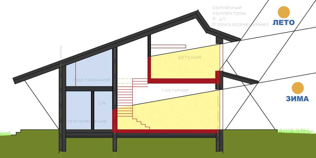 Летом козырьки крыши предотвращают перегрев помещения от прямого солнечного излучения. Зимой энергия солнца улавливается максимально.