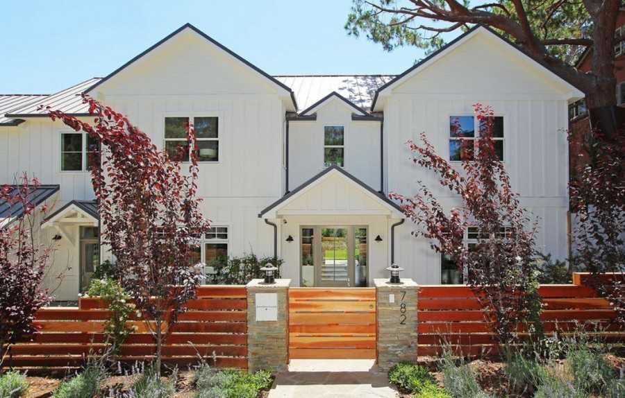 Интересный пример проекта двухэтажного дома представлен на следующем фото. Главная его особенность – функциональный гараж для двух машин, крыша которого используется как просторная терраса (выход на нее спланирован со второго этажа). Очень эстетично и со вкусом устроен внешний фасад дома, где отделка гаража и второго этажа имитирует брус – эффектный контраст, способствующий гармоничному восприятию экстерьера постройки в целом.