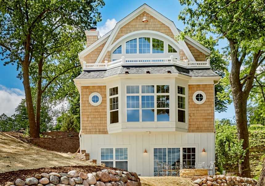 В новой интерпретации шале присутствуют эркер, гараж, колонны и другие особенности, отсутствующие у традиционных строений. Но ни один дом в альпийском стиле не обходится без собственной террасы или веранды.