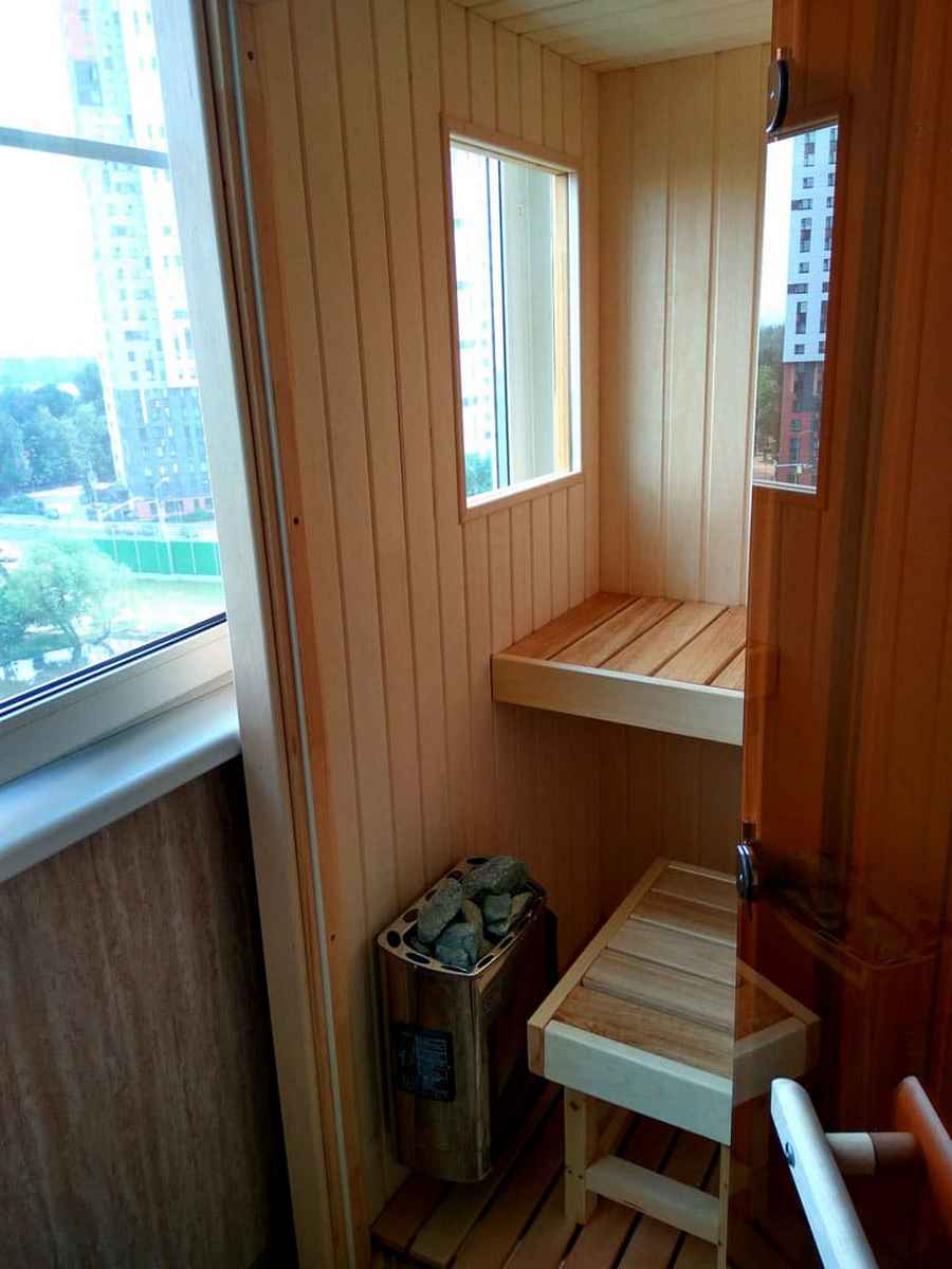 - Балкон или кладовая в том случае, когда сауна будет иметь инфракрасный обогрев. Кстати, сауна на балконе красива тем, что она не будет сокращать жилую площадь квартиры.
