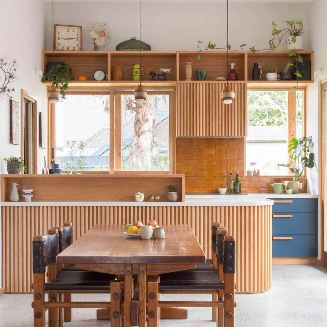 Кухонная мебель предпочтительнее простых форм, в качестве материала можно использовать не только дерево, но и, например, прозрачный пластик – он не будет «мешать» воспринимать стилистическую «картинку», «растворяясь» в пространстве.