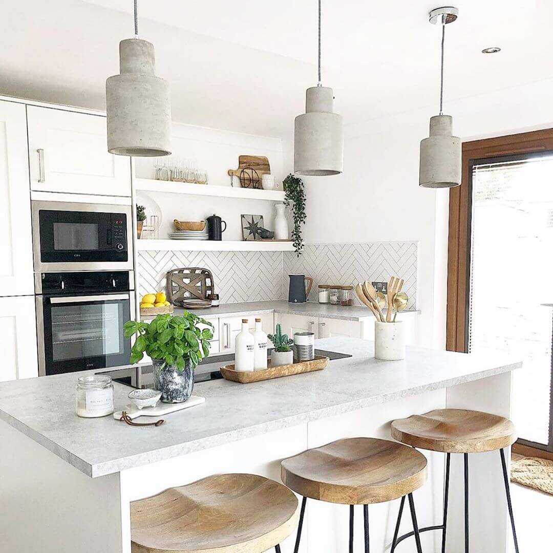 Хотите подчеркнуть близость к природе и сделать интерьер по-настоящему необычным? Подберите акцентный светильник, а заодно используйте его в качестве элемента, разделяющего функциональные зоны кухни. Проще всего добавить эко-элементы в отделку, например, украсив однотонные стены крупным растительным орнаментом или деревянными спилами.