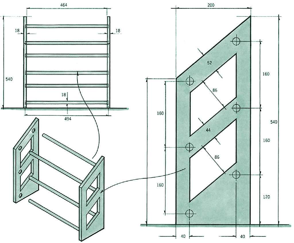 Чертежи этажерки-галошницы в прихожую для каждодневной обуви даны на след. рис. Материал – обрезки сотового поликарбоната и труб ПВХ либо металлопластиковых в ПВХ оболочке. То и другое можно дешево приобрести у сантехников и мастеров по навесам, беседкам, теплицам. Можно использовать и пропиленовые трубы, но тогда в их торцы нужно будет загнать бобышки из твердого дерева и собирать этажерку-галошницу на саморезах, т.к. полипропилен достаточно прочно ничем не клеится. Лунки для труб высверливаются сверлом Форстнера или вырезаются монтажным ножом.