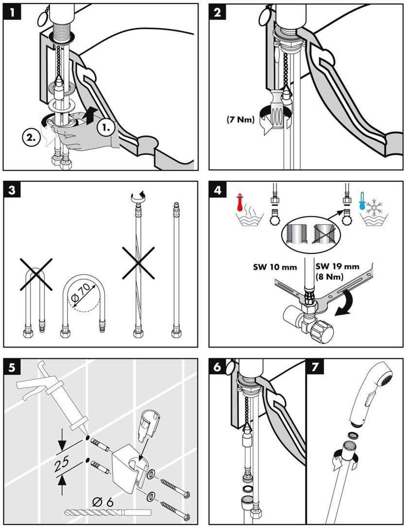 Кран устанавливают в раковину. К нижним штуцерам подключают подводку горячей и холодной воды, шланг гигиенического душа в стальной спиральной оболочке. Открывают вентили магистральных кранов, убеждаются в отсутствии течей. |