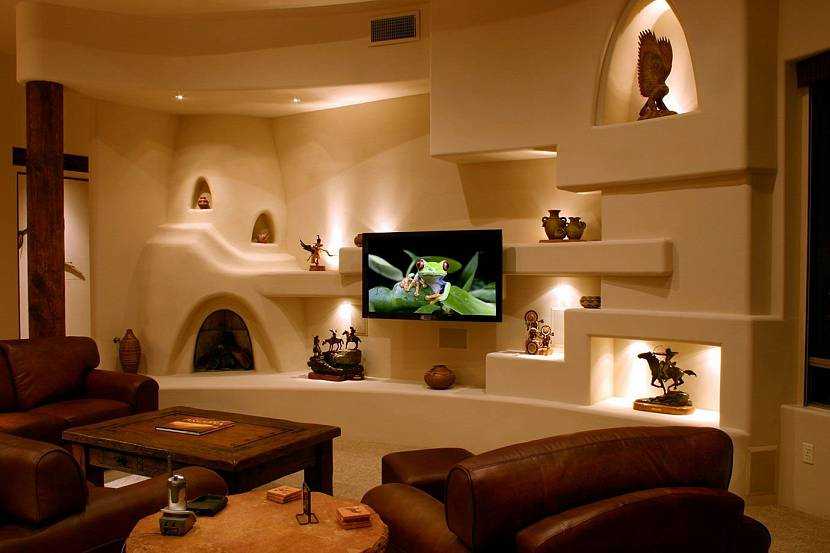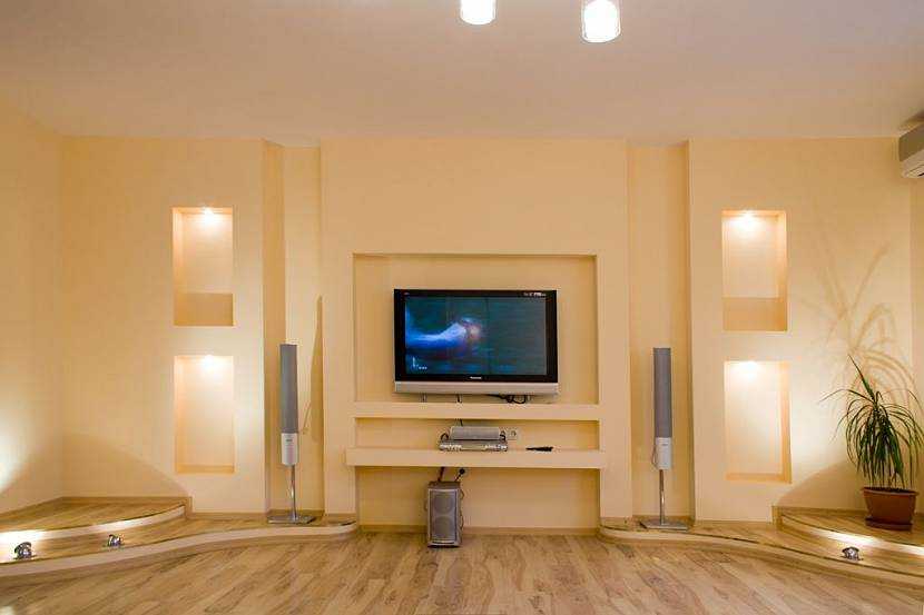 Если вы являетесь обладателем массивной плазменной панели, то просто повесить телевизор на гипсокартон не получится, а наиболее простым, но в то же время оригинальным решением будет являться арка или полка из гипсокартона. В этом случае место установки телевизора нужно предусматривать заранее, чтобы еще при монтаже каркаса под гипсокартон сделать соответствующие усиления металлической конструкции.