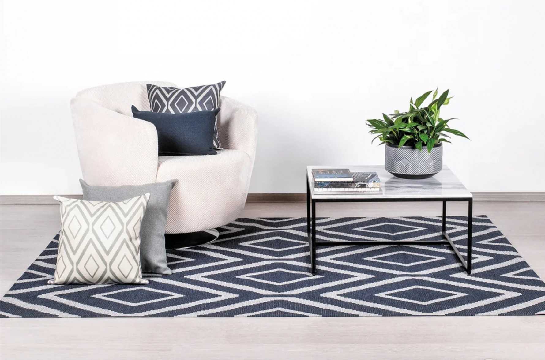 Черный, белый и серый цвета на ковре в интерьере гостиной. Фото