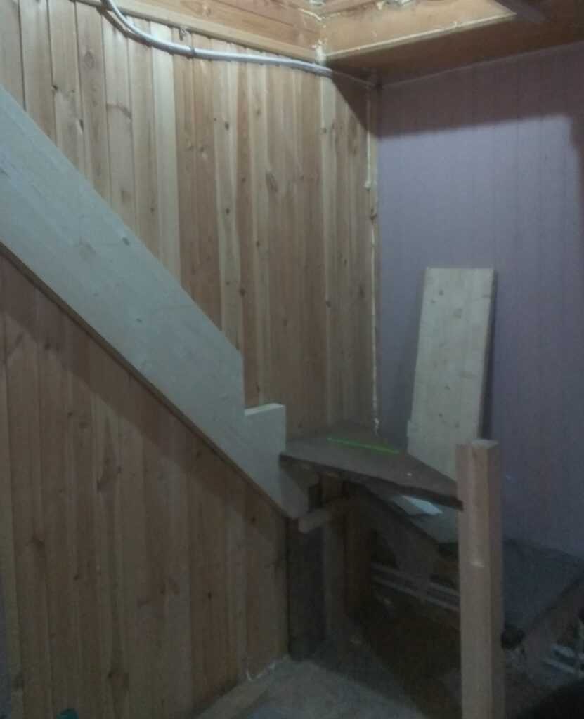 Поворотные ступеньки продаются стандартных размеров, пришлось немного перекроить. Для каркаса в ход пошли останки старой лестницы.