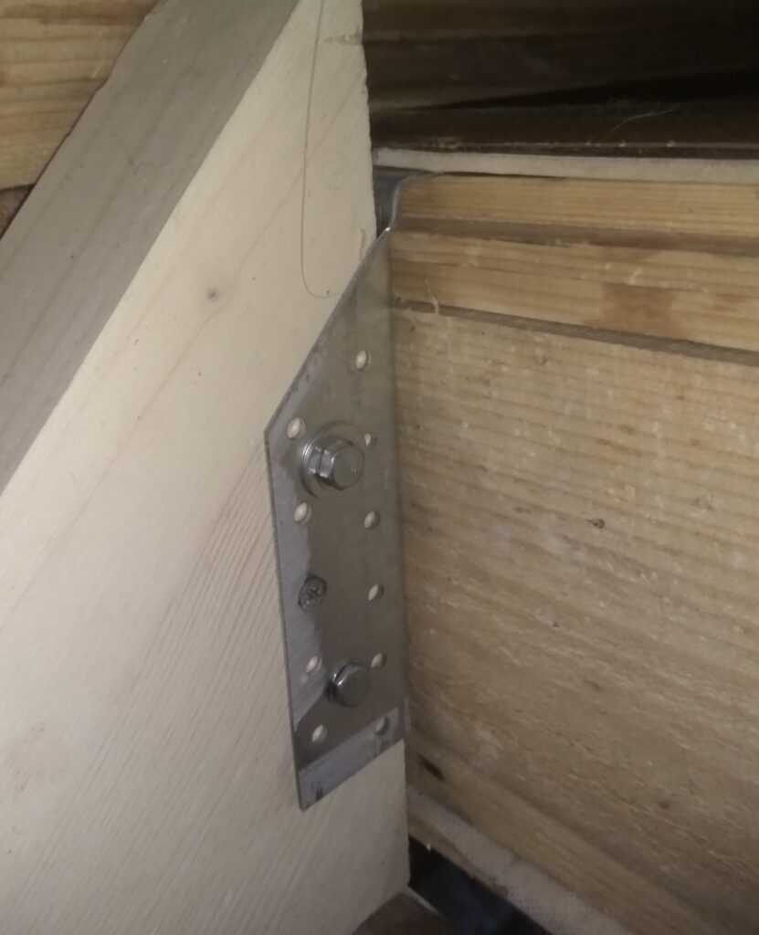 Опорный столб посадили на сантехническую шпильку, с внутренней стороны закрепили уголком, чтобы обеспечить неподвижность.