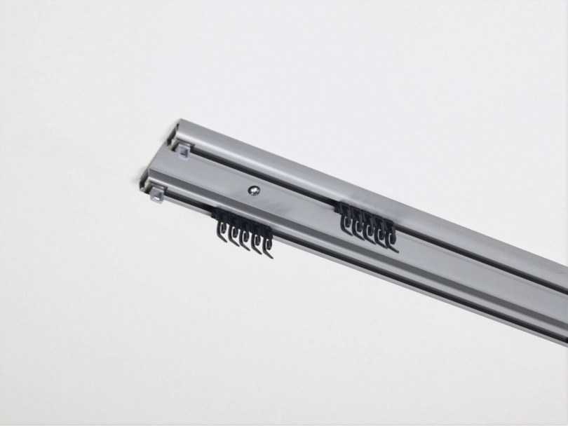 По конструкции можно рассмотреть профильный карниз, который представляет собой профиль, в основном, изготавливаемый из алюминия или пластика. В нем проделаны специальные дорожки, по которым перемещаются крючки. Это простая и надежная система, подходящая для композиции с любым количеством рядов. Ее можно использовать как для стены, так и для потолка. Еще профильные модели называют рельсовые или шинные – по принципу движения крючков крепления.