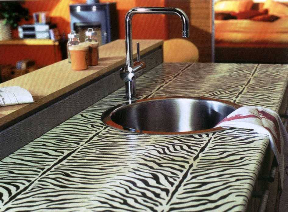 Этот материал часто путают с предыдущим. Но столешницу из жидкого камня отличает иная технология изготовления. Это способ облицовки поверхностей, в результате которой материал обретает нужные для кухни эксплуатационные характеристики – ударопрочность, устойчивость к воздействию высоких температур, влагостойкость.