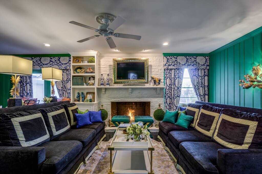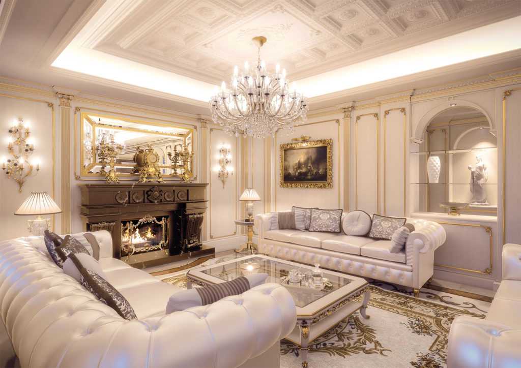Мебель в классической гостиной начинается с центральной точки, которая делит комнату на две симметричные части, встроенные в зеркало. Центральным пунктом может быть камин, к которому добавляются два одинаковых кресла слева и справа или два удобных дивана с текстильной или кожаной обивкой, обитой декоративными подушками, для дополнительного комфорта.