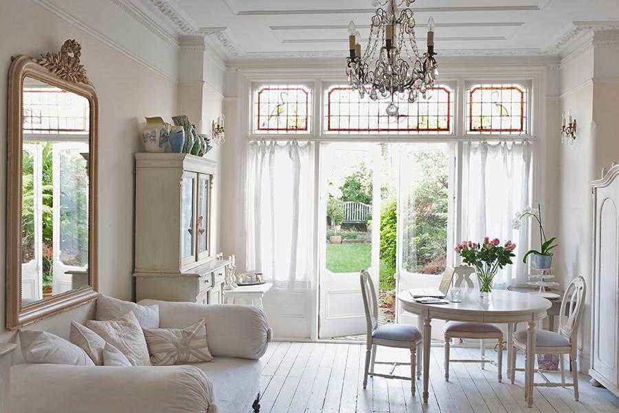 - Формы элементов декора округлые, нежные, почти романтичные и подчеркивают идею комфорта. Стулья мягкие, подушки многослойные, а диваны обитые.