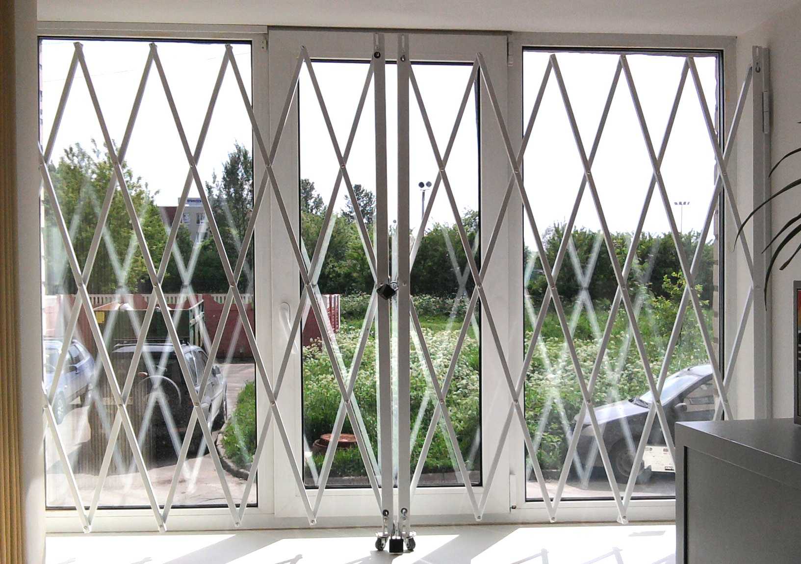 - Раздвижные (распашные) приспособления. При действии данного механизма производится открывание отдельных створок решётки (либо всех вместе при необходимости) или складывание (смещение) части конструкции в сторону благодаря специальным шарнирам. Несмотря на внешнюю доступность для грабителей, раздвижные решётки наиболее выгодны с точки зрения эвакуации людей при пожарах. Для освобождения окна достаточно просто открыть ключом замки на креплениях. Ключ от замков рекомендуется держать внутри помещения, расположив на видном месте и обозначив его местоположение сигнальными табличками.