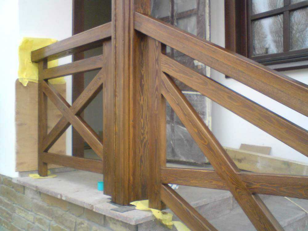 С древесиной все и проще и сложнее. Как известно, она неплохо себя чувствует и на улице, но также как и черный металл, требует тщательной обработки. Перед установкой/монтажом элементы деревянных перил для лестницы пропитывают защитными составами для наружного применения
