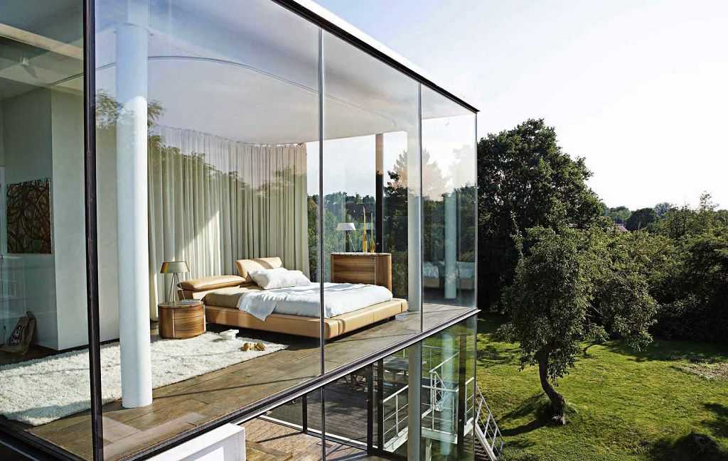 Окна большого размера привлекают всеобщее внимание, поэтому лучше устанавливать такое остекление в домах, расположенных на загородном участке, окруженных садом. Для того чтобы обезопасить себя от чужих взглядов, можно использовать плотные шторы или стеклопакеты с различным уровнем прозрачности
