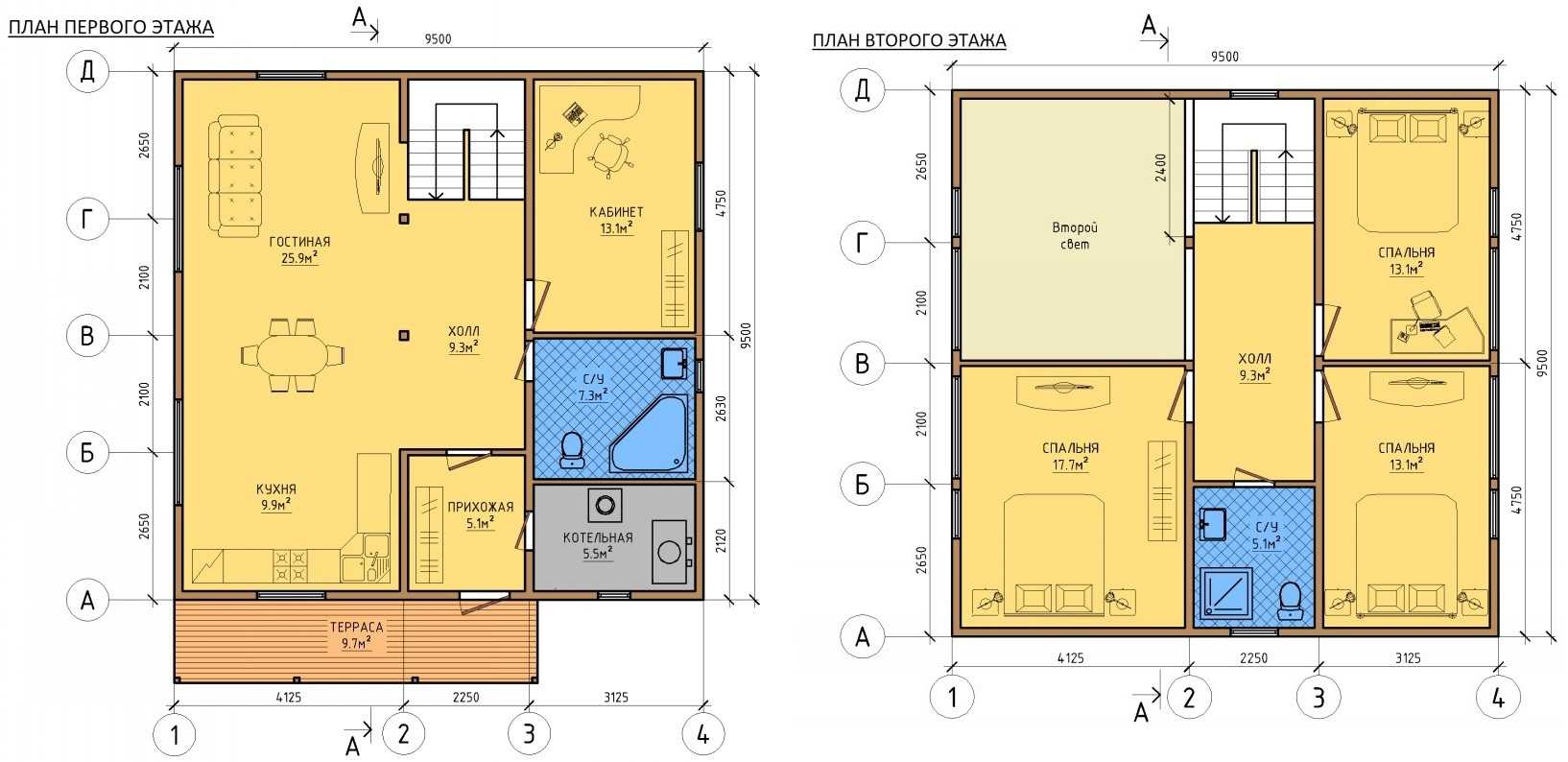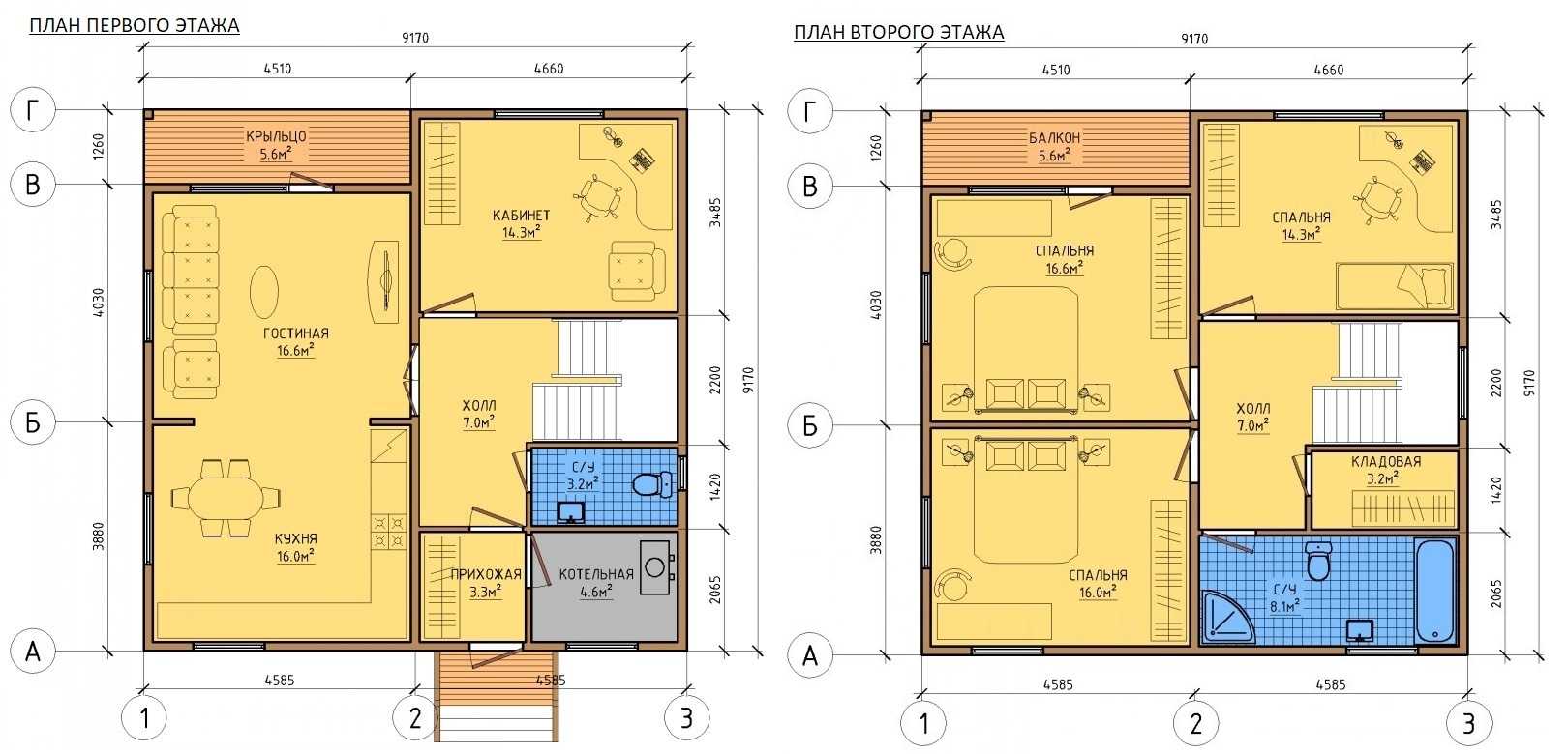 В среднем полезная площадь в каркасных домах 7х9 м составляет от 125 до 135 м2. По планировке они практически идентичны друг другу, конечно же, если не используется индивидуальный оригинальный проект.