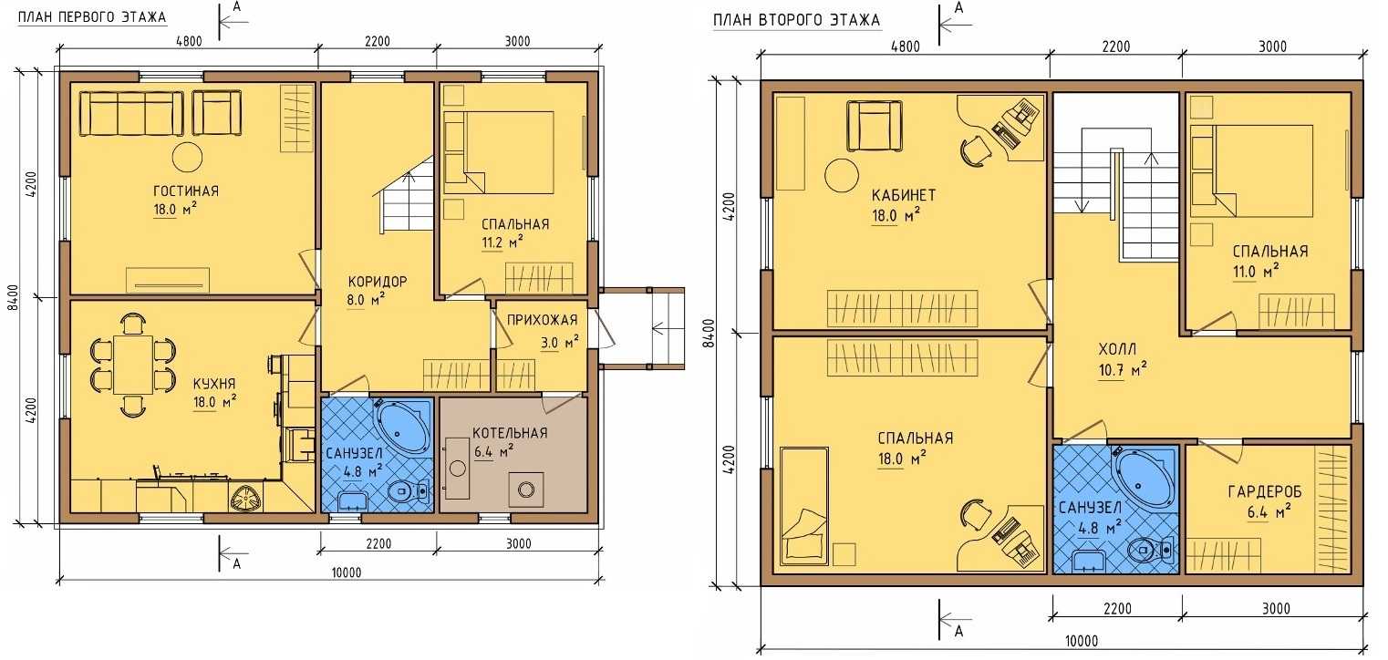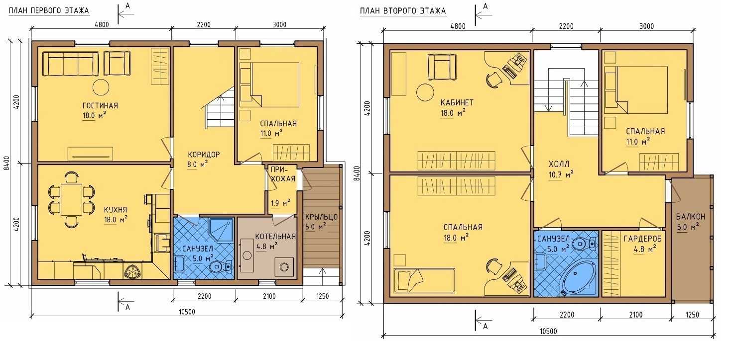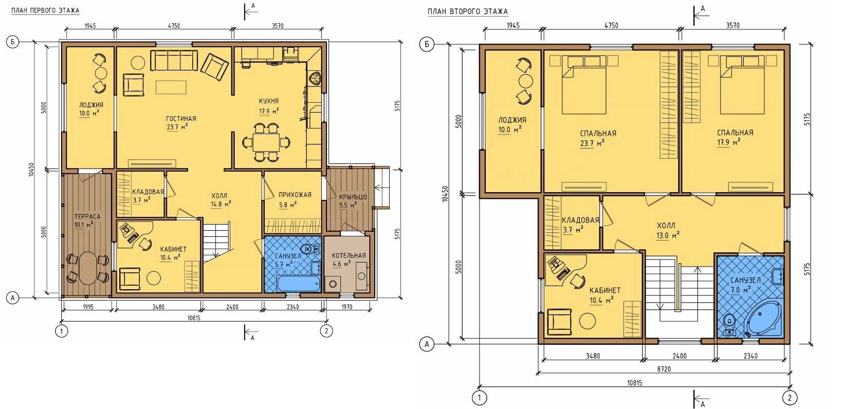 Площадь дома может достигать 100-120 м2. Поэтажная планировка помещений распределяется так: