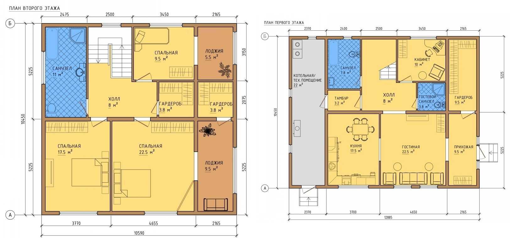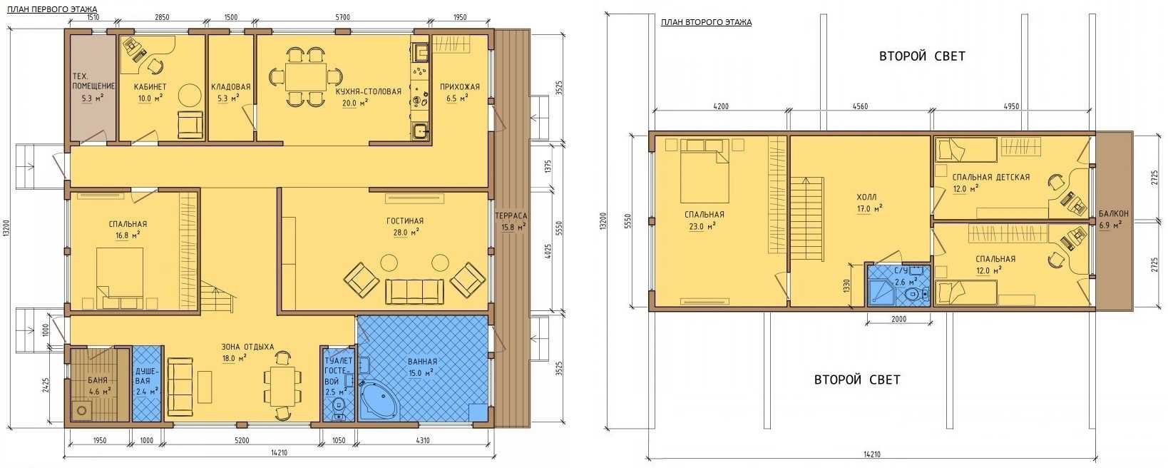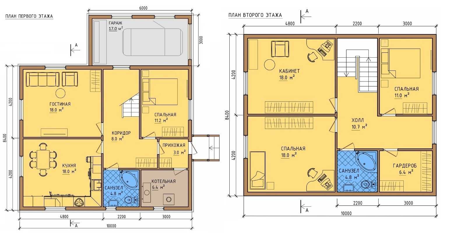Площадь дома может достигать 100-120 м2. Поэтажная планировка помещений распределяется так: