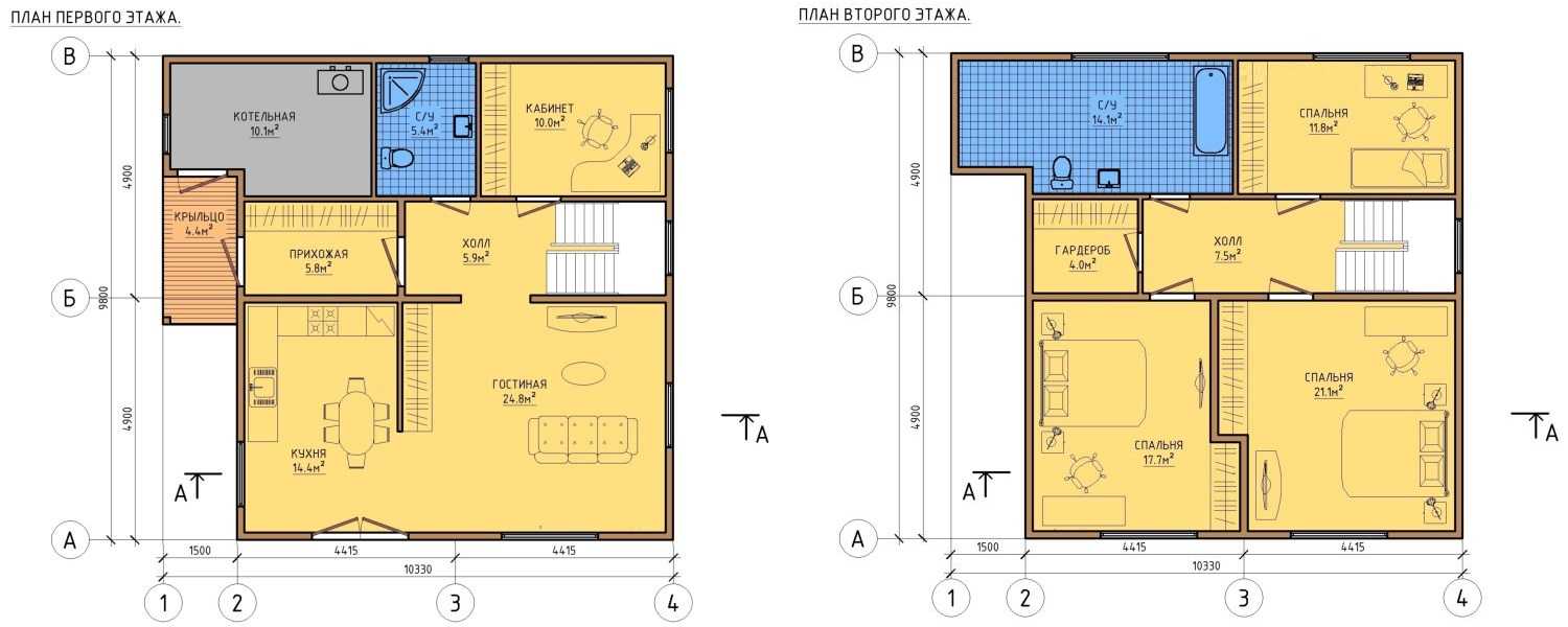 На первом этаже пространство поделено между тамбуром, холлом, гостиной или общим залом, кухней. Возможны ванная комната (душевая кабинка) и туалет для гостей, а также гостевая комната.